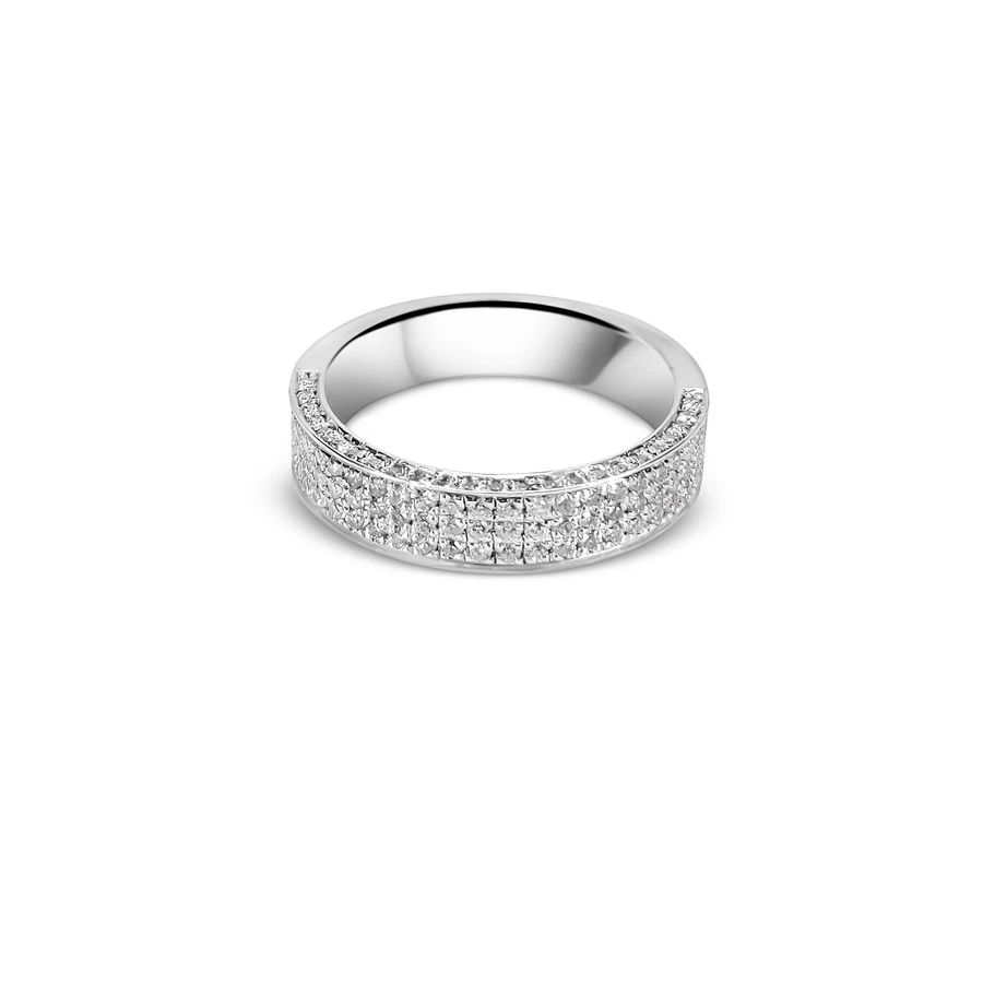 השיבוץ הצפוף והעדין מעניק לטבעת מרקם זוהר ועשיר, כשהעיצוב הרחב יוצר נוכחות בלתי מתפשרת על היד.