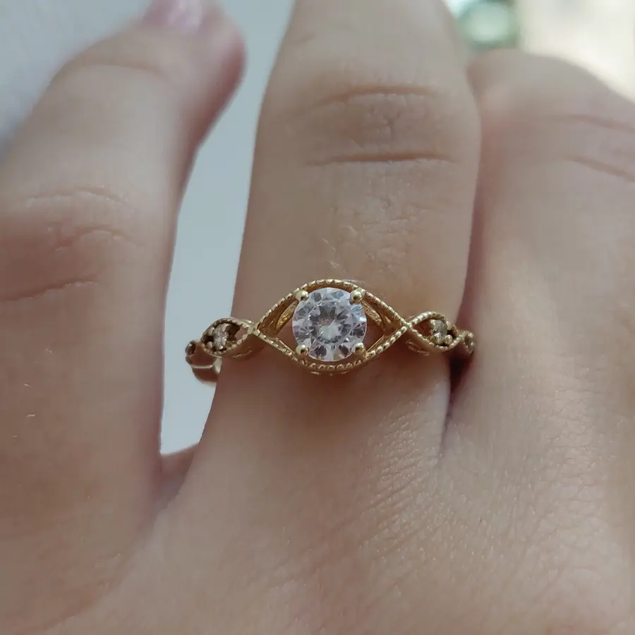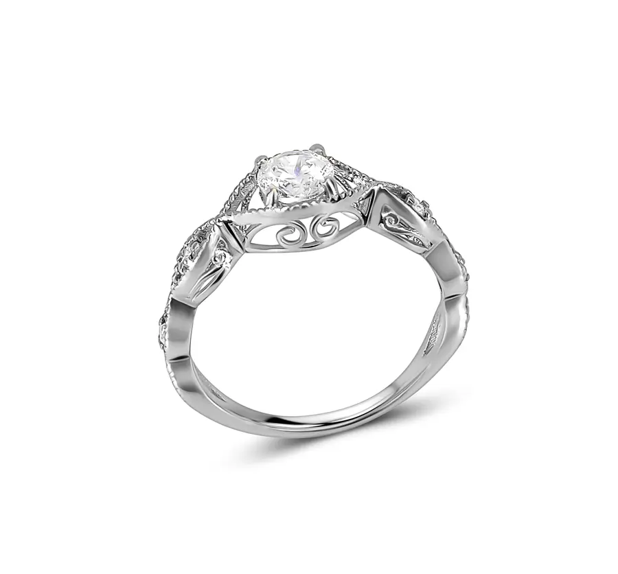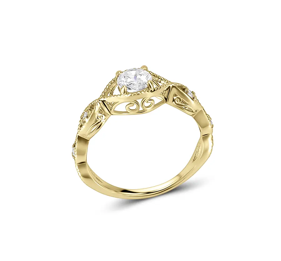טבעת עדינה ונשית עם יהלום מרכזי, שיבוץ של יהלומים קטנים ועיטורים מיוחדים שיוצרים משחק אור ייחודי. סה״כ 1.05 קראט של יהלומי מעבדה.