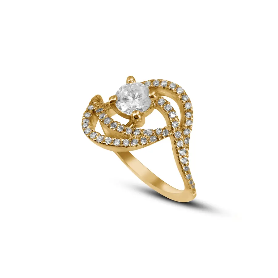 Sharon היא טבעת עם נוכחות של כתר: יהלום מרכזי בולט, מוקף במעגל מרשים של 64 יהלומים קטנים שמעניקים אפקט של פרח מלא אור.