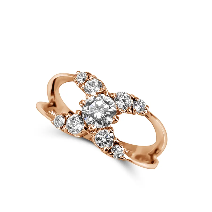Adria היא טבעת שלא דומה לשום דבר אחר: עיצוב מיוחד, יהלום מרכזי מרשים, ולצידו ארבעה יהלומים בינוניים וארבעה קטנים.