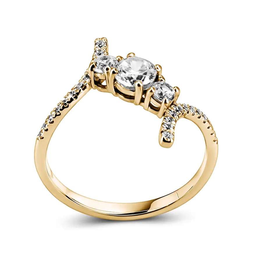 טבעת זורמת עם יהלום מרכזי גדול, שני בינוניים וגל של יהלומים קטנים מכל צד. קלאס באפס מאמץ.