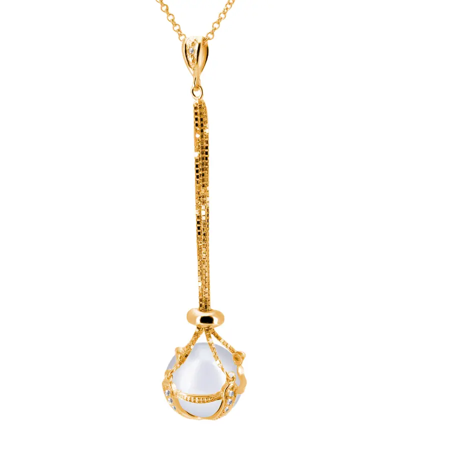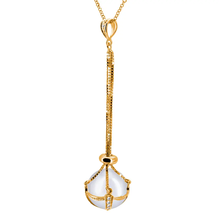 פנינה בוהקת יושבת בתוך מבנה עדין שמזכיר סל קטן, שמעניק לתכשיט תחושת קלילות וחיבוק עדין.