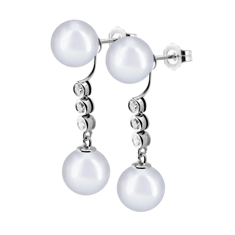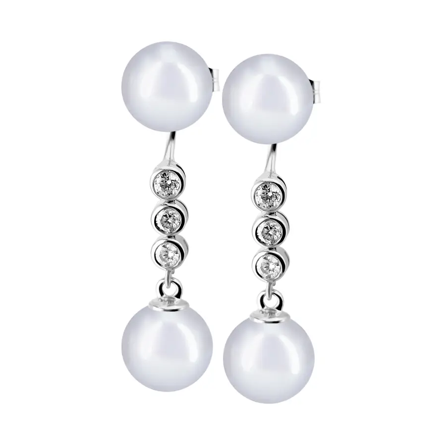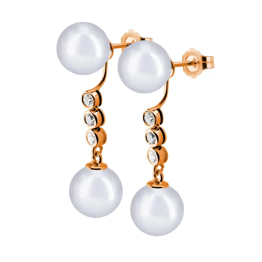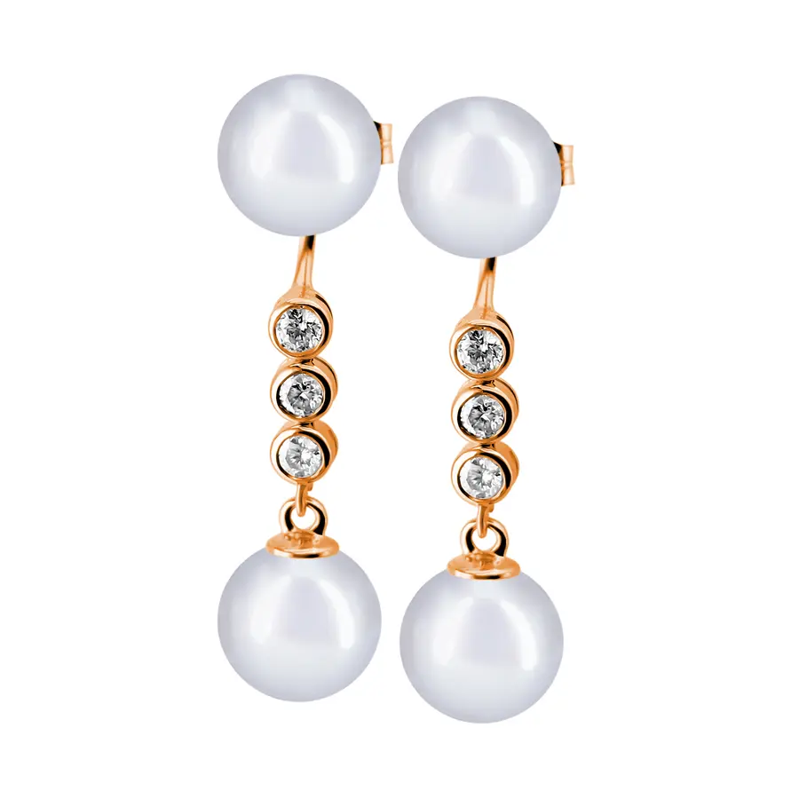 פנינה על האוזן, שלושה יהלומי מעבדה 0.05 קראט עגולים על כל עגיל ופנינה – מראה מלכותי ועדין.