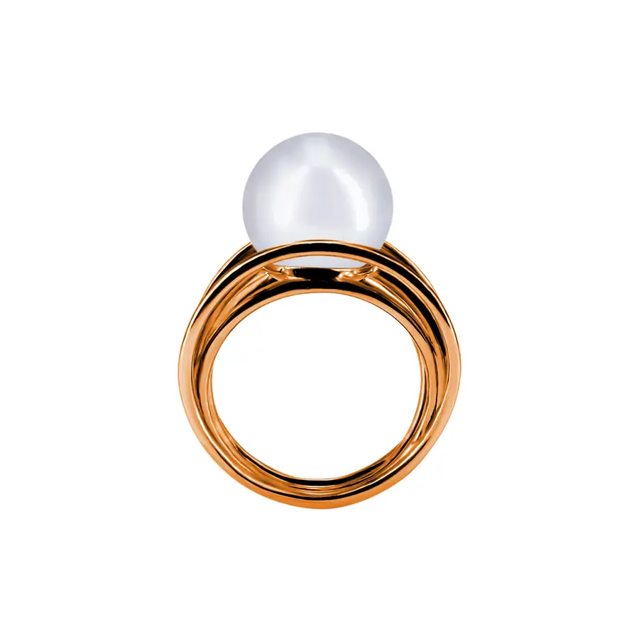 💍 טבעת זהב עם חישוקים ופנינה במרכז במראה מודרני ומלא תנועה וייחודיות.
