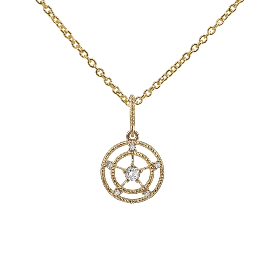 תליון בקוטר 10 מ"מ משובץ יהלום מרכזי ו-5 יהלומים קטנים, מעוצב בהשראת סמלים של הובלה פנימית וכיוון מדויק — כמו כוכב שמאיר דרך בלילה או הגה שמוביל במסע על פני הים. הברק שמפוזר סביב המרכז יוצר תחושה של תנועה מעגלית והרמונית, כזו שמזכירה קצב טבעי ומרגיע.