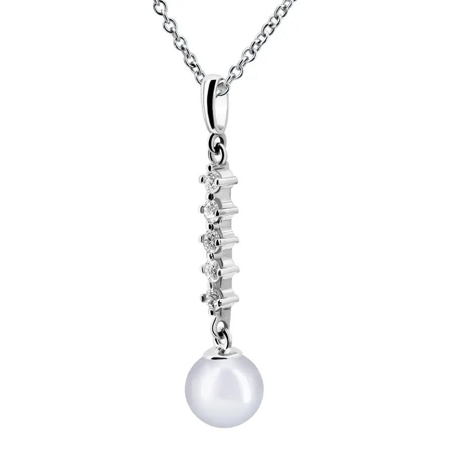 חמישה זרקונים מסודרים בטור מתמשך שמושך את העין ומוביל לפנינה תלויה שמוסיפה רכות נשית.
