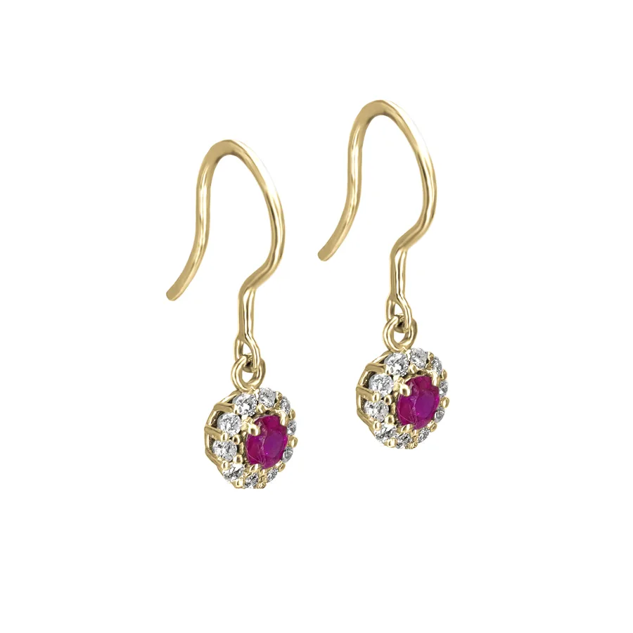 עגילי זהב תלויים על וו, עם אבני רובי 3 מ״מ במרכז והילת יהלומים עדינה מסביב.