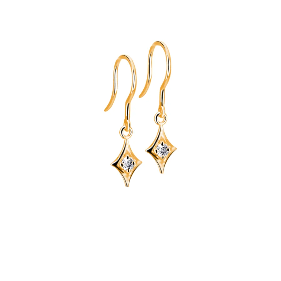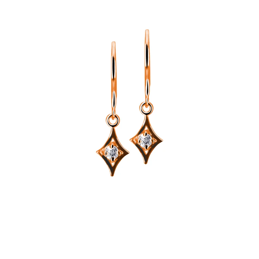 עגילי זהב תלויים בצורת מעויין עם צלעות קעורות, משובצים ב-2 יהלומים (סה״כ 0.10 קראט) ומתנדנדים בעדינות ליצירת מראה מודרני ונשי.