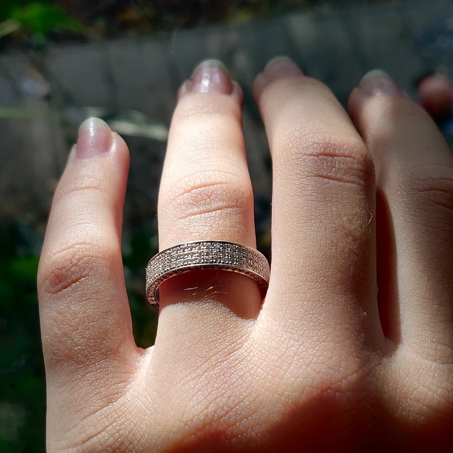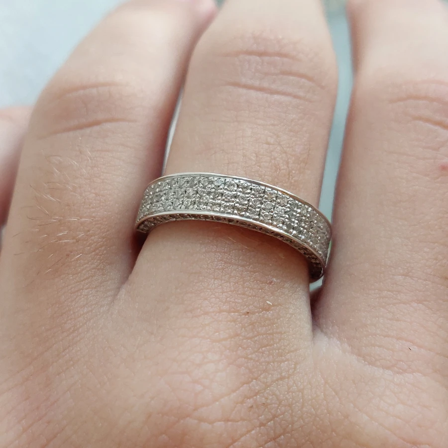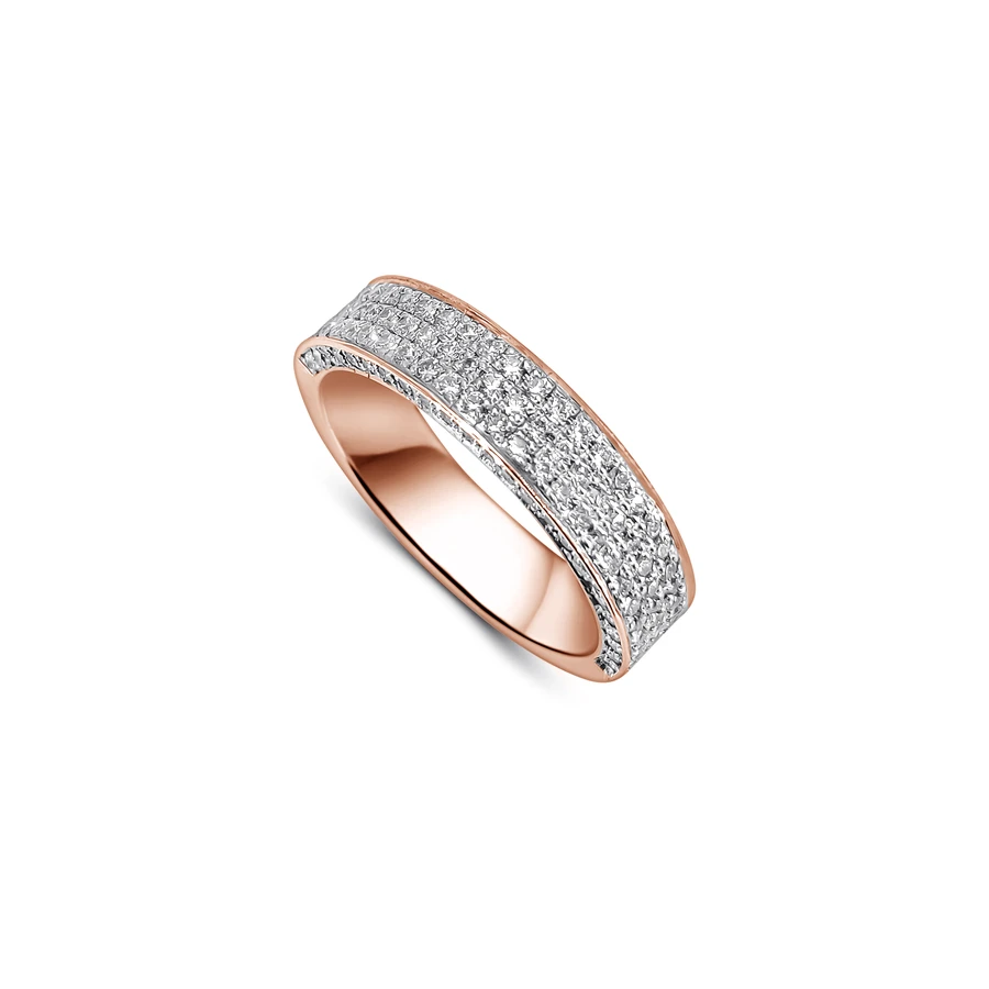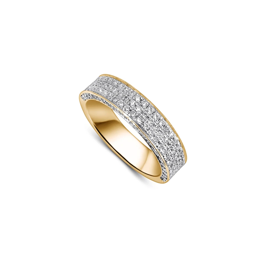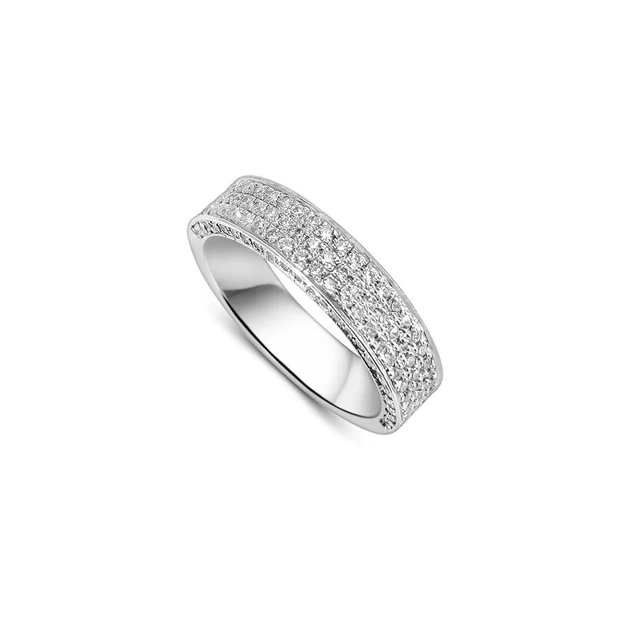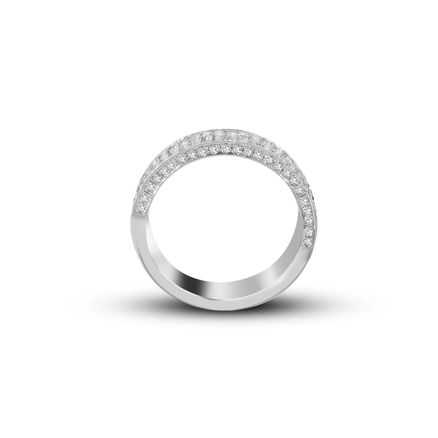 השיבוץ הצפוף והעדין מעניק לטבעת מרקם זוהר ועשיר, כשהעיצוב הרחב יוצר נוכחות בלתי מתפשרת על היד.