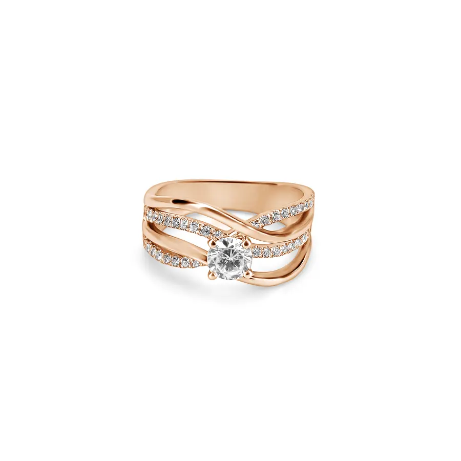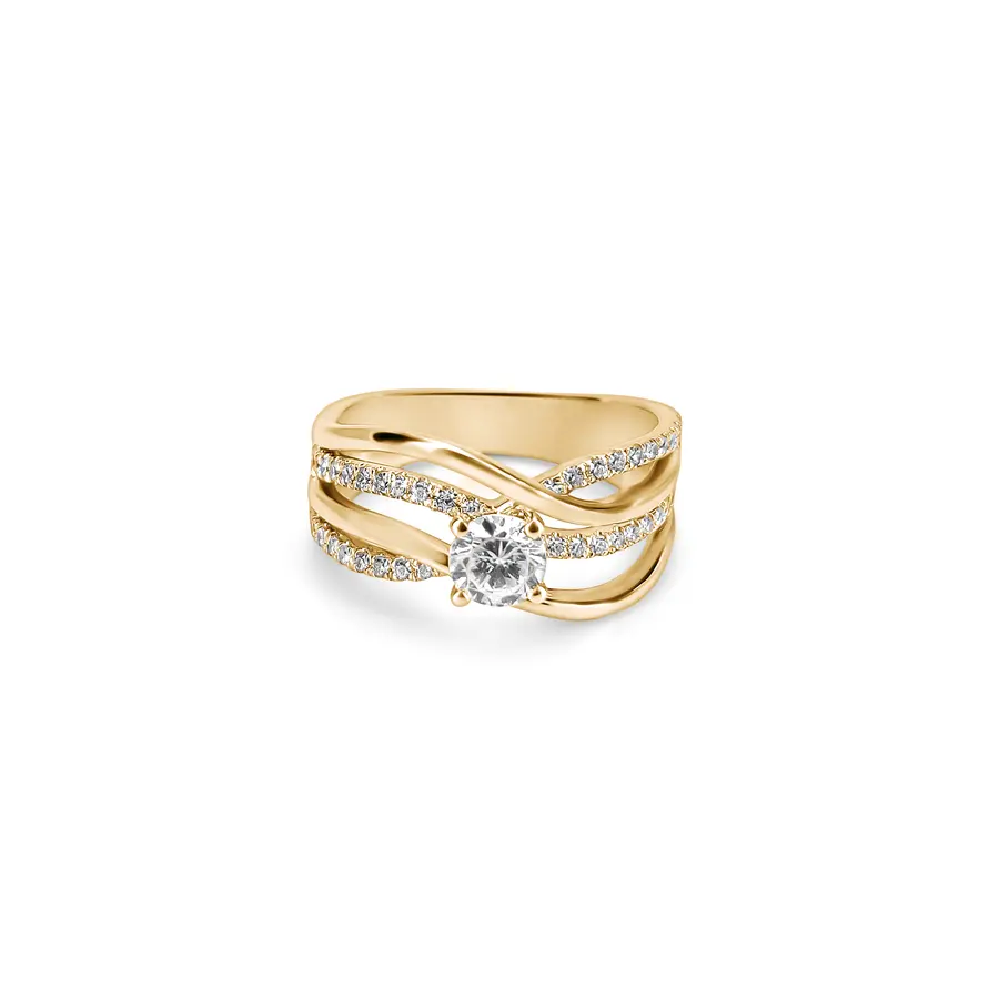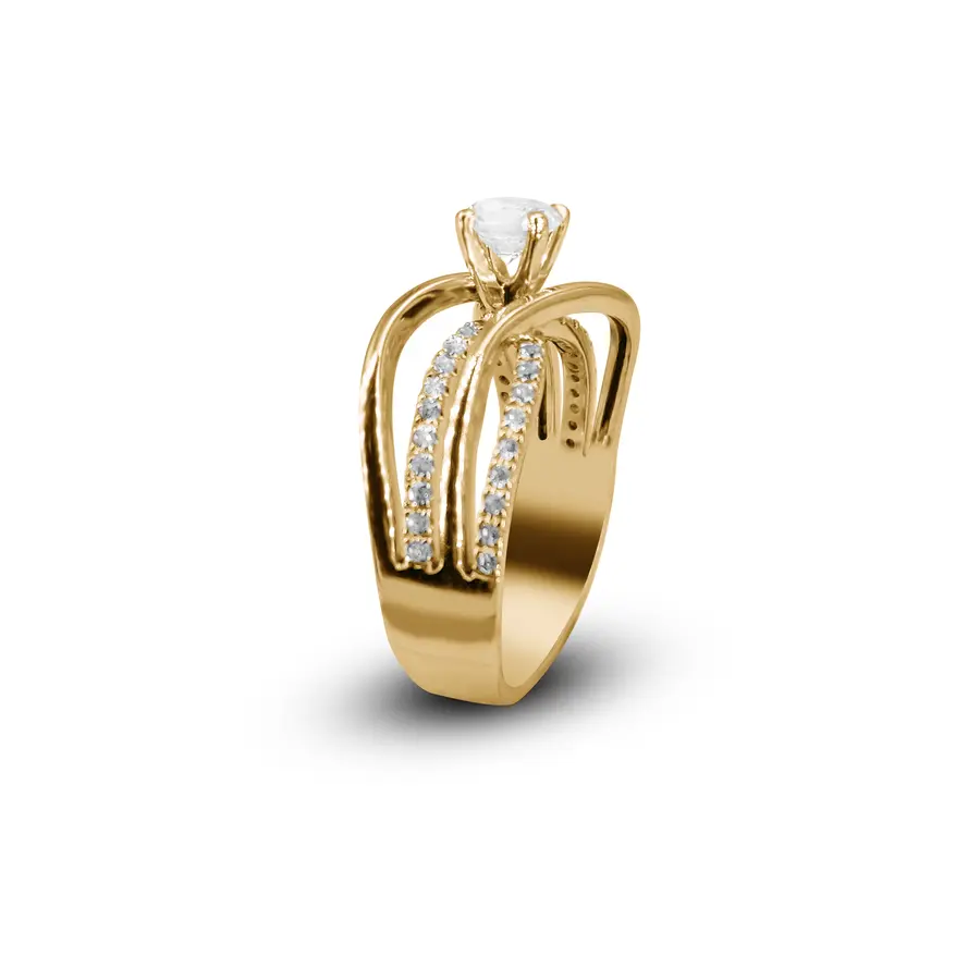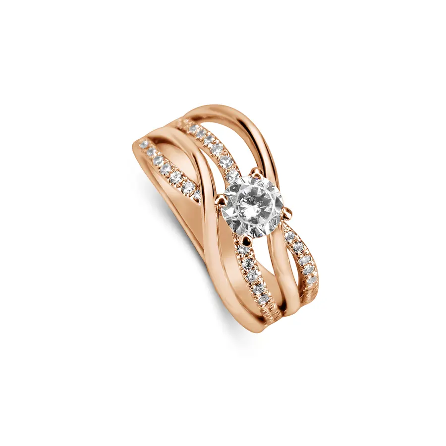 יהלום מרכזי מוקף גלים עדינים של יהלומים שנותנים מראה ייחודי ויוקרתי. סה"כ 0.60 קראט של יהלומי מעבדה