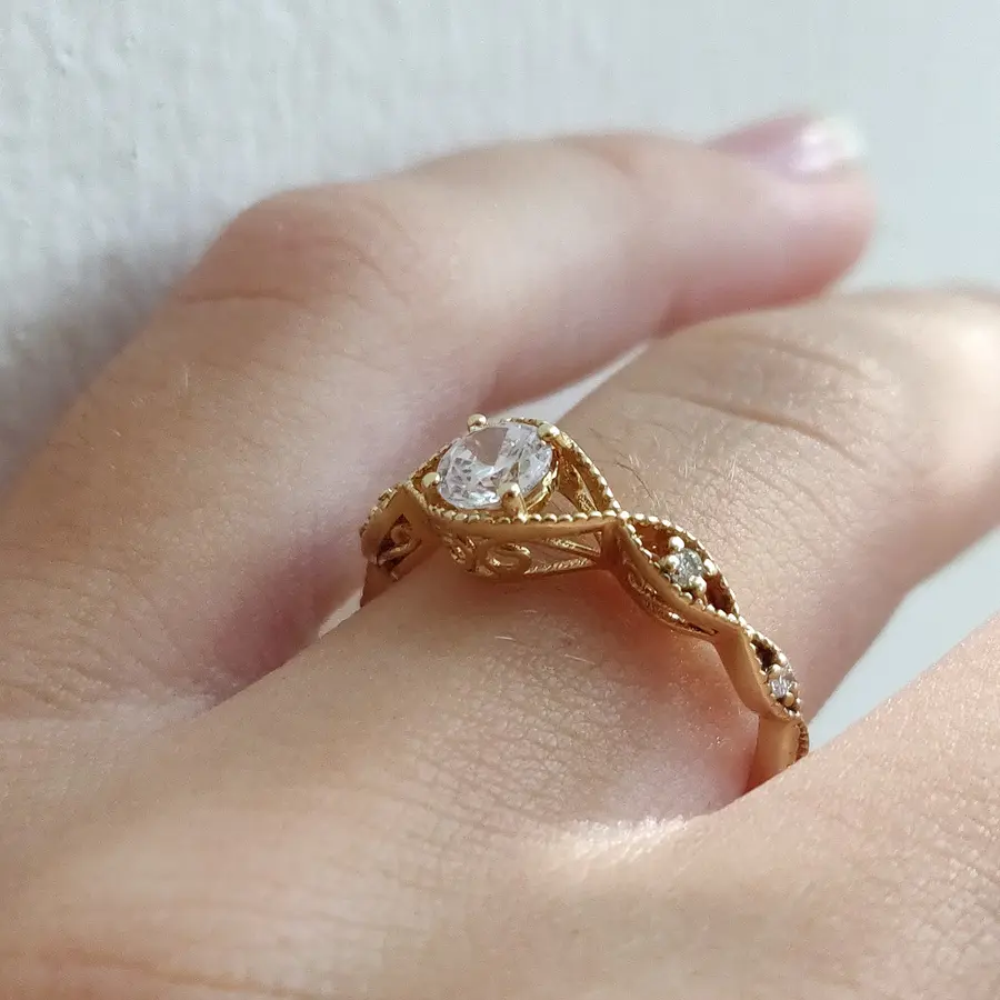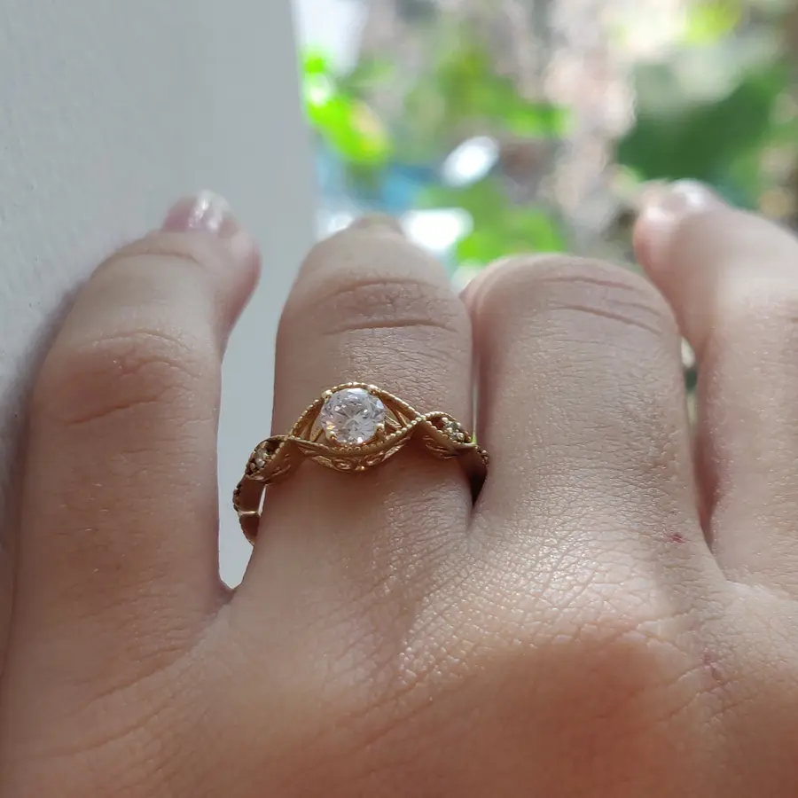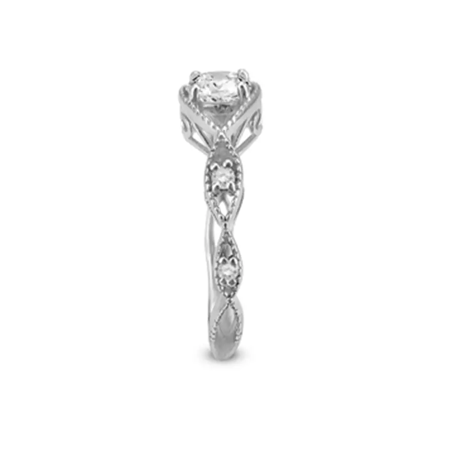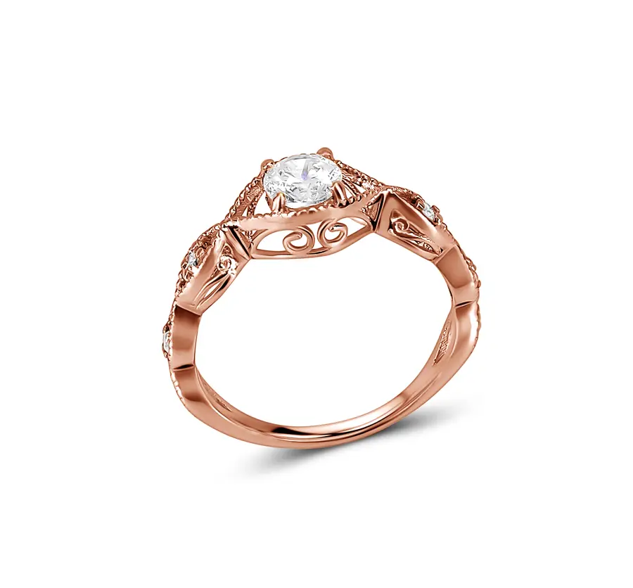 טבעת עדינה ונשית עם יהלום מרכזי, שיבוץ של יהלומים קטנים ועיטורים מיוחדים שיוצרים משחק אור ייחודי. סה״כ 1.05 קראט של יהלומי מעבדה.
