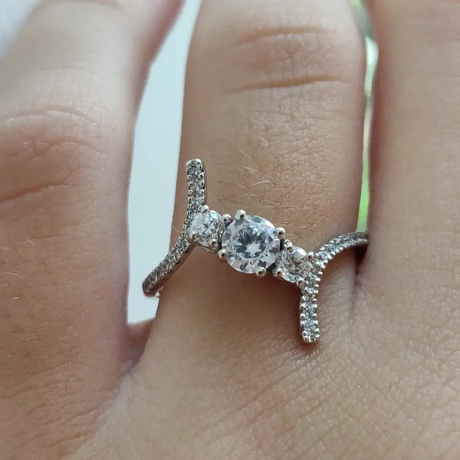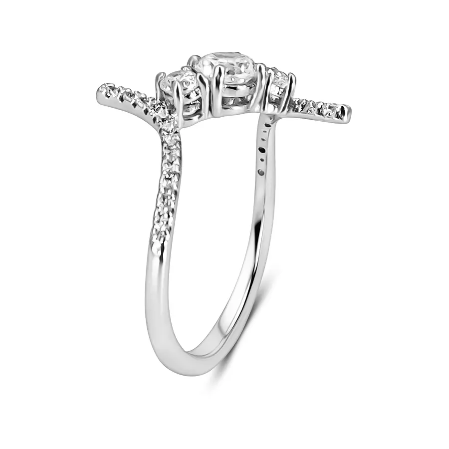 טבעת זורמת עם יהלום מרכזי גדול, שני בינוניים וגל של יהלומים קטנים מכל צד. קלאס באפס מאמץ.