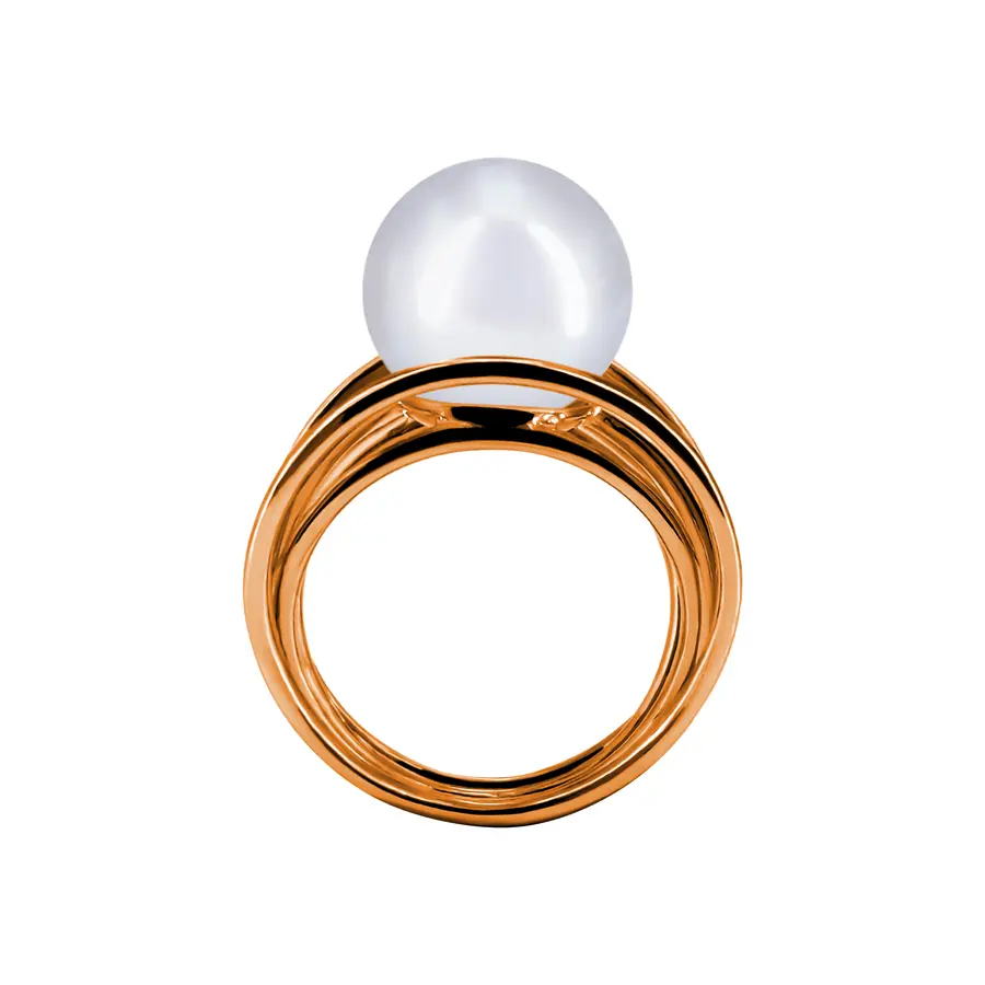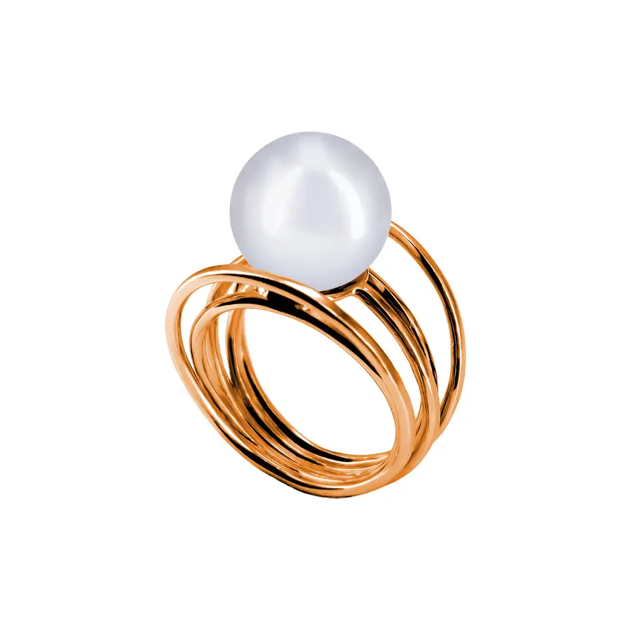 💍 טבעת זהב עם חישוקים ופנינה במרכז במראה מודרני ומלא תנועה וייחודיות.