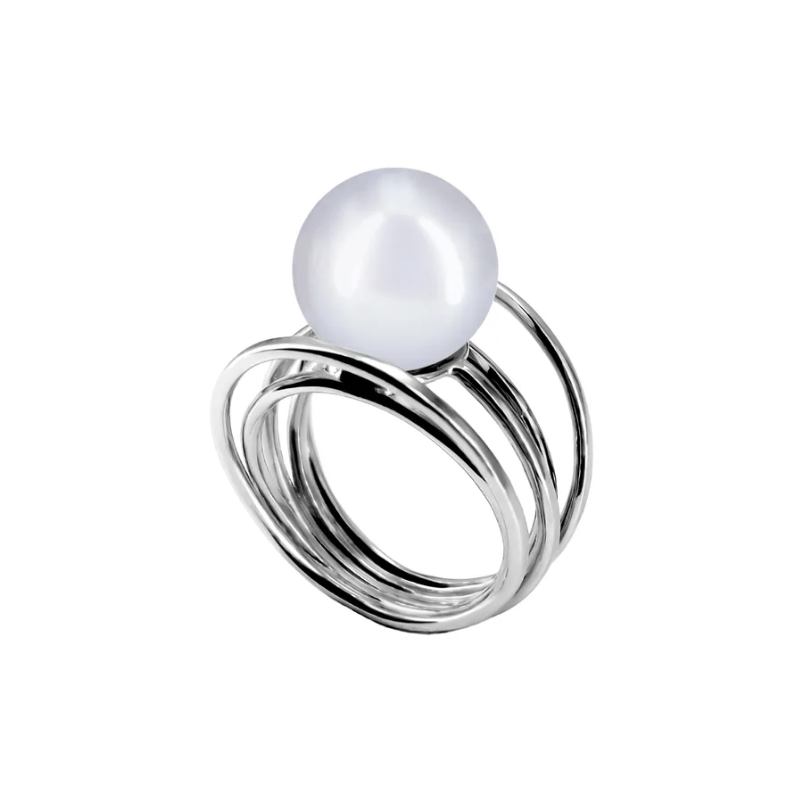 טבעת כסף עם חישוקים ופנינה במרכז במראה מודרני ומלא תנועה וייחודיות.