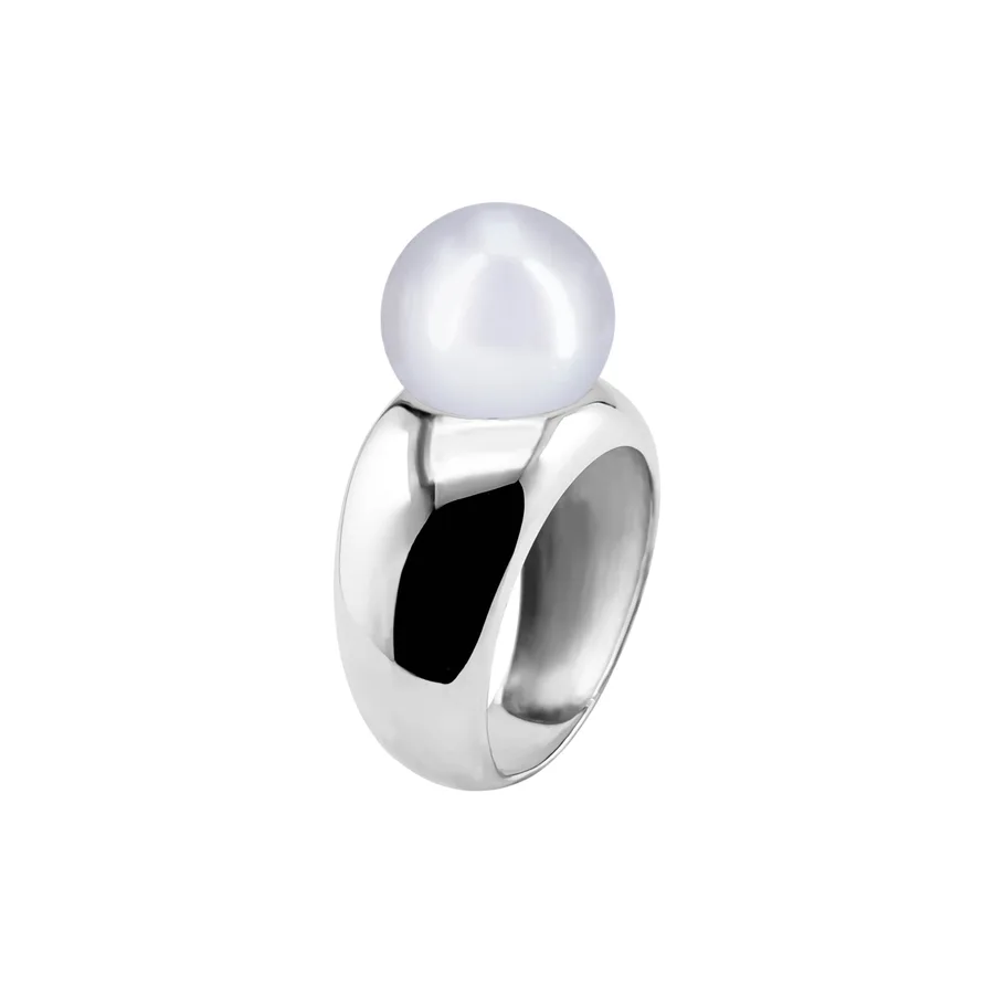 טבעת כסופה עבה עם פנינה גדולה במראה מודרני ונקי