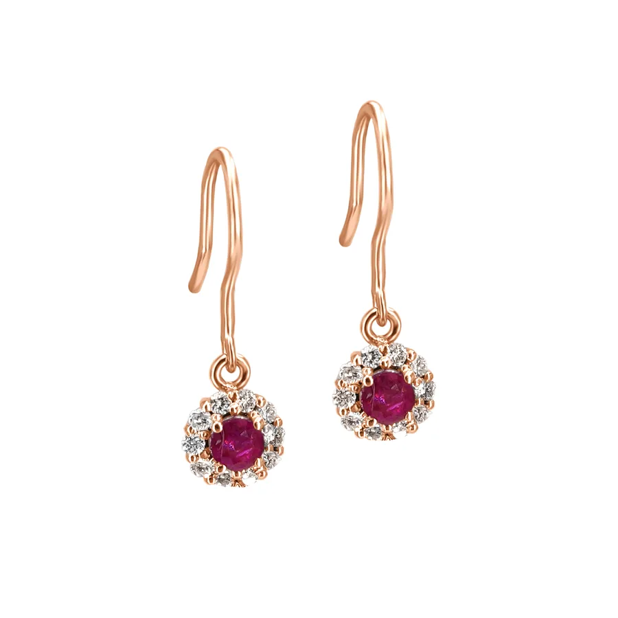 עגילי זהב תלויים על וו, עם אבני רובי 3 מ״מ במרכז והילת יהלומים עדינה מסביב.