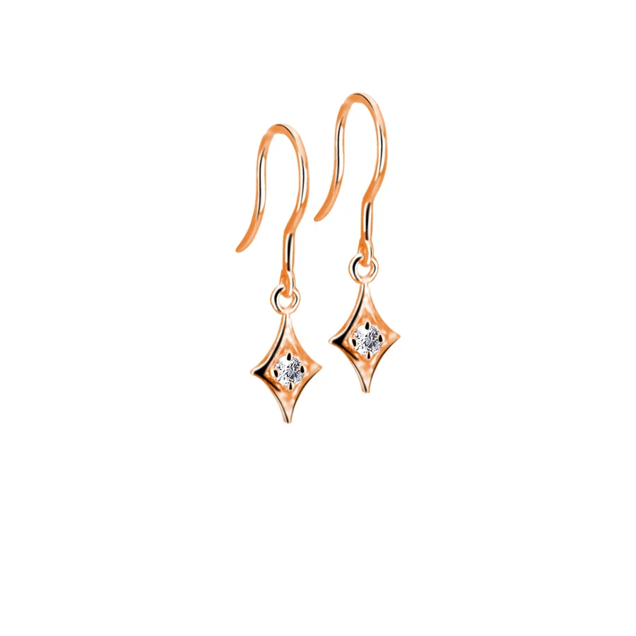 עגילי זהב תלויים בצורת מעויין עם צלעות קעורות, משובצים ב-2 יהלומים (סה״כ 0.10 קראט) ומתנדנדים בעדינות ליצירת מראה מודרני ונשי.